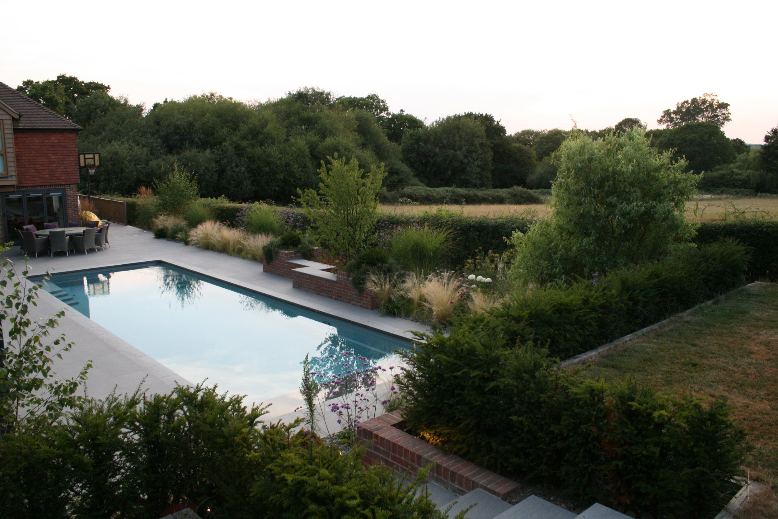 Key species include Betula, Amelanchier, Hydrangea, Taxus, Buxus and a range of ornamental herbs and perennials, chosen to balance structure with a lighter, more natural feel around the pool and terraces.