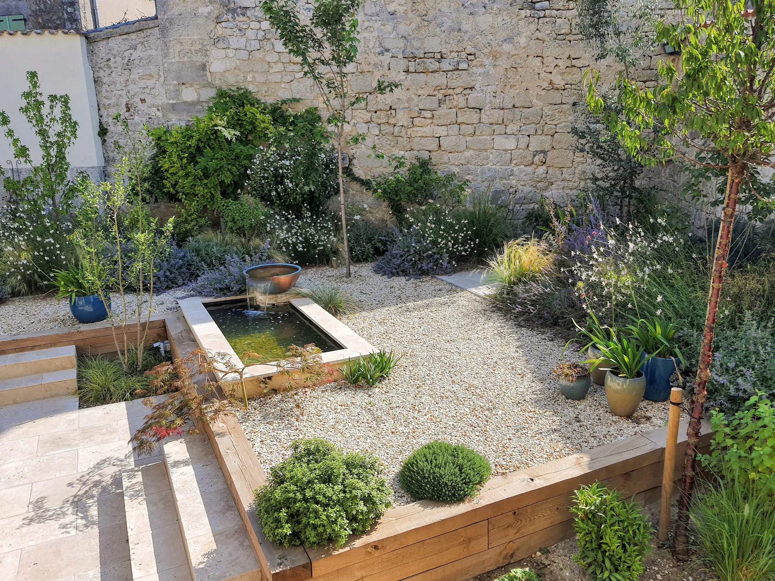 Two seating areas were created on different levels to add height variation and allow the garden to be experienced from multiple viewpoints. A small water feature was introduced as a focal point, fed by an overflowing copper bowl that provides gentle sound and movement without dominating the space.