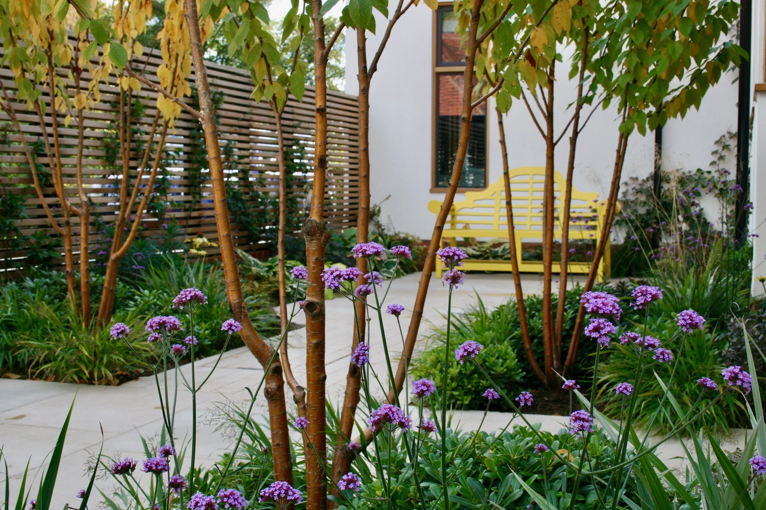 Four Prunus × maackii, chosen for their distinctive cinnamon-coloured polished stems, lead the eye from the driveway towards the front door. Their light canopy allows sunlight to penetrate the space while providing structure and vertical emphasis.